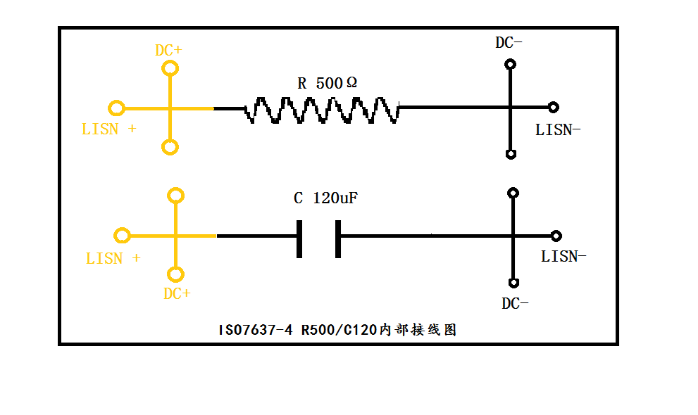 7637-4R500/120產(chǎn)品滿足ISO 7637-4中A波、B波、C波中匹配阻抗和回路電容的要求,可單獨(dú)使用電阻或者電容,也可將電阻電容并聯(lián)到回路使用。