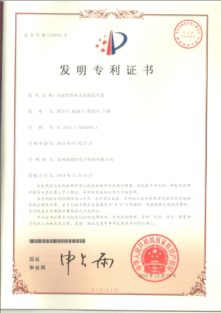 企業(yè)快訊   近日,我公司再次獲得一項(xiàng)國家發(fā)明專利證書“多波形的沖擊電流發(fā)生器”,本次專利是公司獲得的第20項(xiàng)專利。蘇州泰思特是一家尊重知識(shí)產(chǎn)權(quán)的公司,長期以來重視科技創(chuàng)新,我們會(huì)更加努力的開拓進(jìn)取,爭取獲得更多的研究成果并將之轉(zhuǎn)化為生產(chǎn)力。