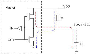上拉電阻應(yīng)安置在OD輸出端附近。當(dāng)I2C總線上主從器件(Master &